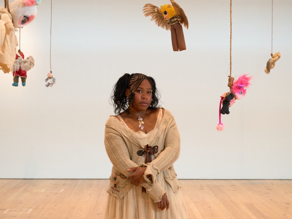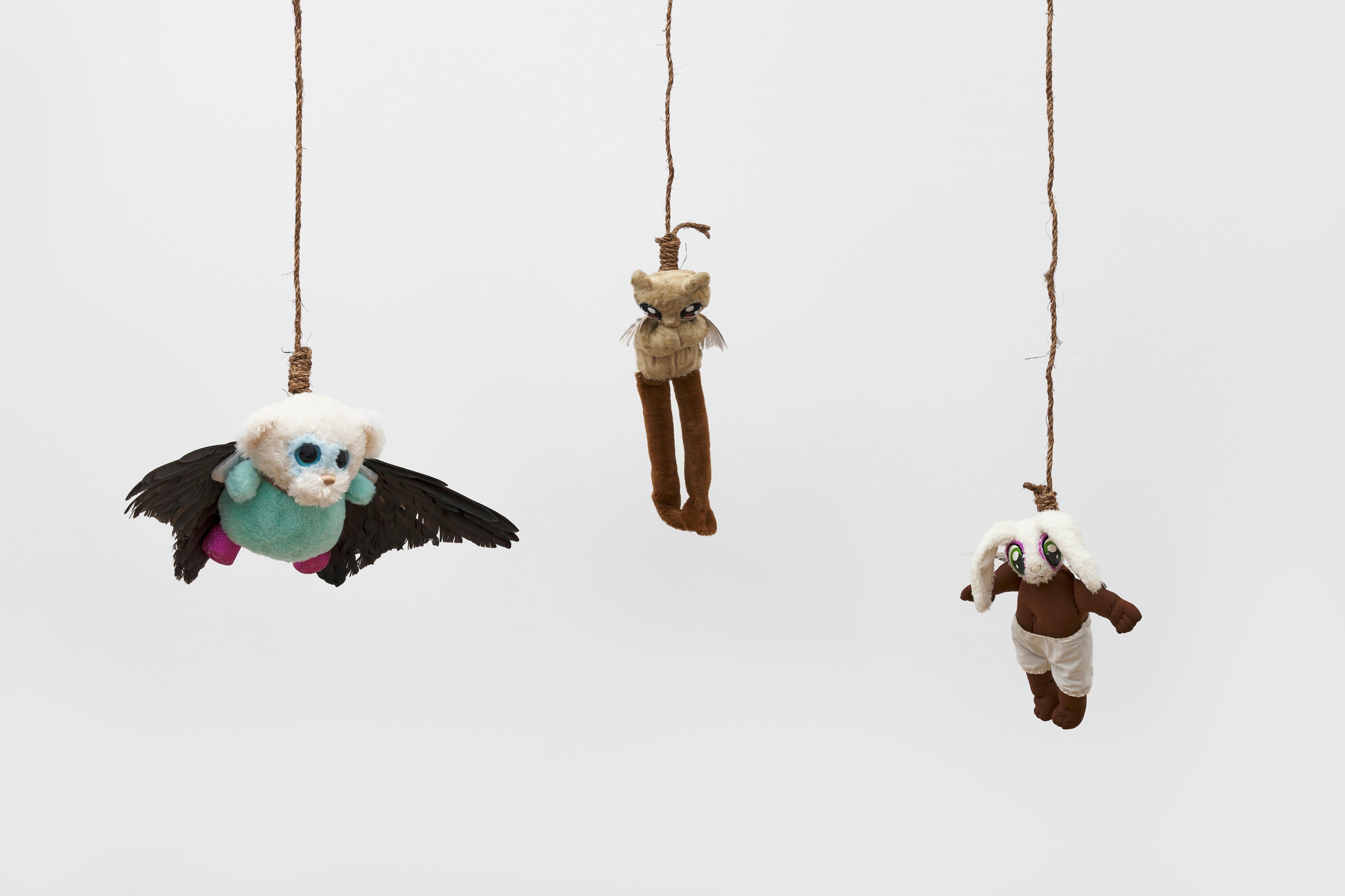 Drew Sawyer, who co-curated the Whitney Biennial with Marcela Guerrero, told ARTnews that Okoyomon creates “stunning installations that also carry dark, unsettling narratives.” As an example, he noted that the plush animals in the Whitney show bear signs of wear. “It’s clear they were loved,” he said, “so there’s a very tender aspect. But they’ve been abandoned, and these birds are dead. There’s both grief and violence, and they’re suspended from nooses, which evoke associations such as lynching and suicide.”
