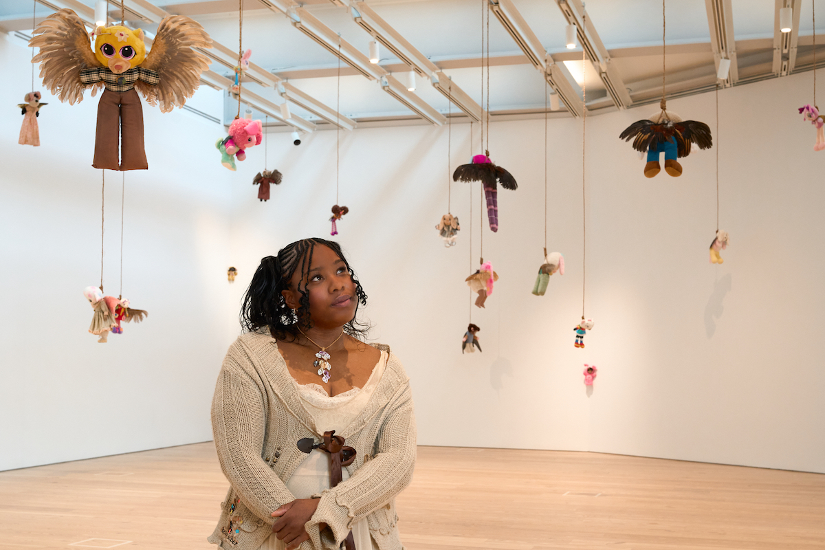 This piece is an expanded and reimagined iteration of a work first presented in 2025 at Austria’s Kunsthaus Bregenz, a renowned contemporary art institution. Okoyomon’s installation brings together roughly 50 stuffed animals and dolls suspended from the rafters above. Natural light streams through a skylight rarely visible to visitors, heightening the installation’s eerie allure. The result is a visually captivating yet unsettling atmosphere, blending innocence with discomfort a contrast that has become central to Okoyomon’s practice and solidified their position among today’s most compelling sculptors.
